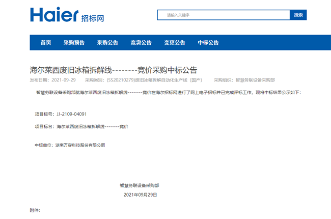 9月29日,万容科技中标海尔集团旗下海尔莱西废旧冰箱拆解线项目。该项目是海尔集团旗下青岛海绿源循环科技有限公司废旧冰箱回收拆解利用的重点项目。项目采用万容科技双轴撕碎机+立式破碎机+大风量稀释环...