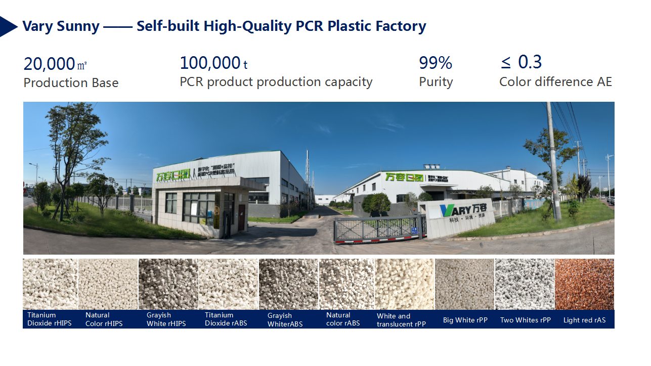 In 2018, Vary Tech built its own high-quality PCR recycled plastic utilization factory to promote the high-quality utilization of waste home appliance plastics. At present, the factory has achieved an annual crushing, cleaning and granulation capacity of 50,000 tons, producing series products such as rHIPS, rABS, rPP and rAS, with a color difference ΔE < 0.3 and a purity of 99%. In 2024, the "digital and intelligent credible traceability" system built by the factory has greatly improved the high quality and trustworthiness of PCR recycled plastics through digital "traceability + monitoring". This system has become a key support for helping international brands and downstream customers realize the compliant use of recycled plastics and effectively prove green supply chains.